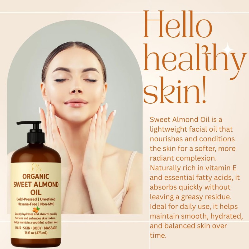 Organic Sweet Almond Oil – 100% Pure, Unrefined, Extra Virgin Carrier Oil for Face, Hair, Body & Massage – Lightweight, Non-Greasy, Unscented, Hexane-Free – 16 fl oz Glass Bottle with Pump