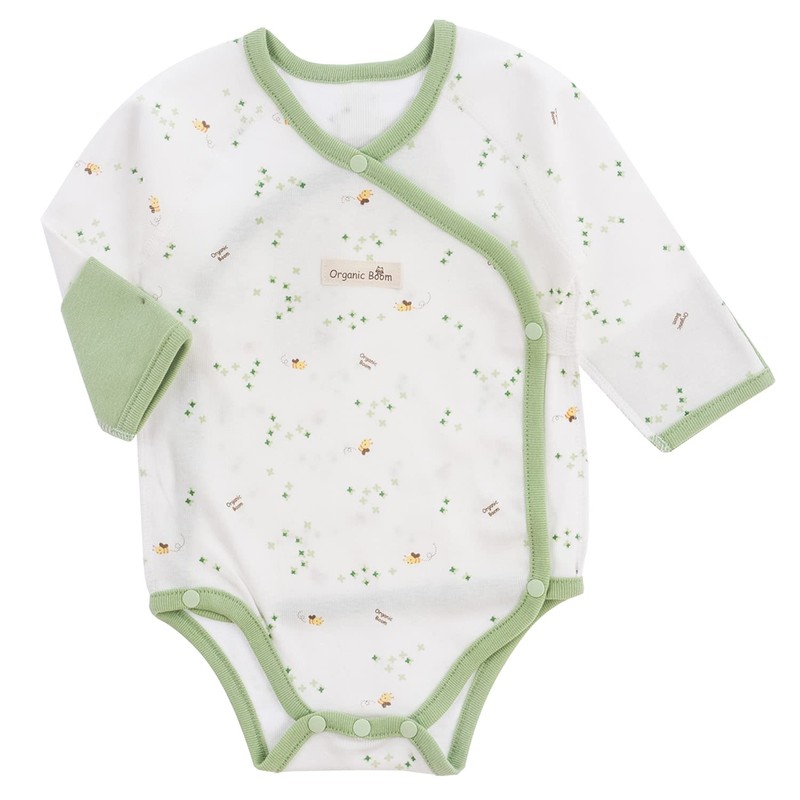 organicboom 100% Organic Cotton Side Snap Kimono Onesie Bodysuit With Mitten Cuffs (HoneyBee, 3-6M)