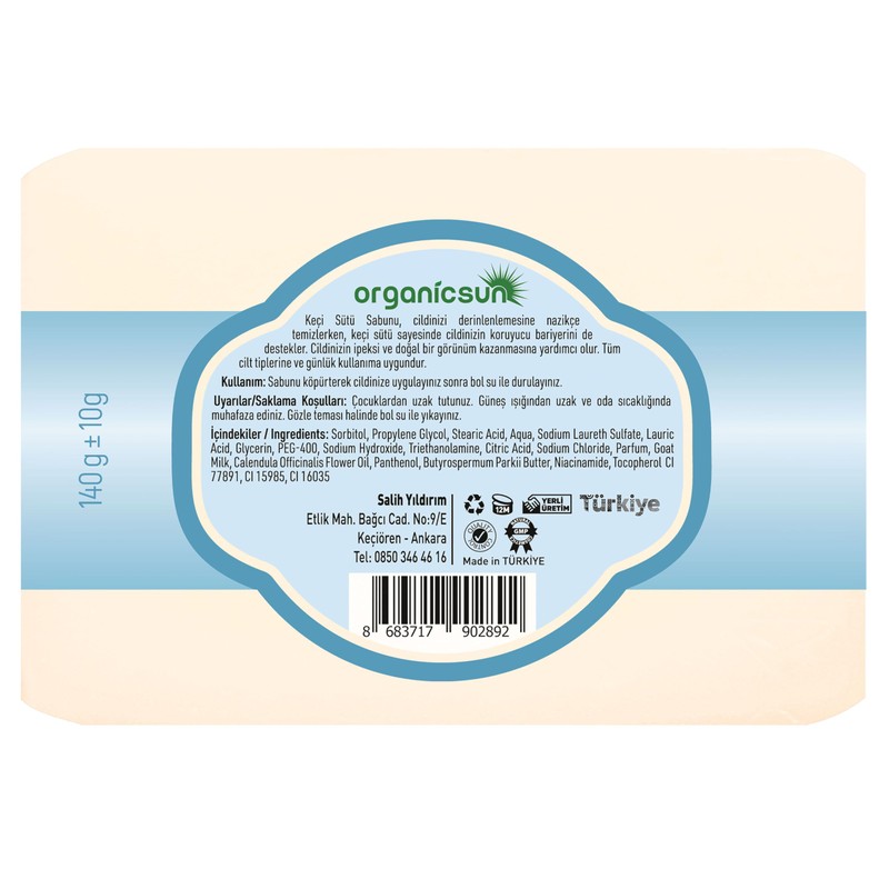 - Organicsun Keçi Sütü Sabunu ile Doğanın Gücünü Hissedin! 🌿💪 Organicsun Keçi Sütü Sabunu, cildinizi derinlemesine temizlerken doğal besleyici özellikleriyle cilt bakımınızı bir üst seviyeye taşır. Zengin keçi sütü içeriği sayesinde cildinizi nemlendirir 💧, besler 🌱 ve korur 🛡️. Antioksidan özellikleri ile cildinizdeki serbest radikallerle savaşır, sağlıklı ve parlak bir cilt görünümü sağlar ✨.