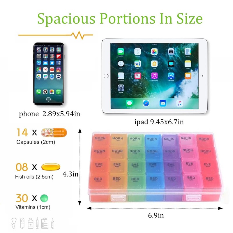 - 【Large Capacity 7-Day Pill Box Organizer】This pill box can store 8 fish oils, 15 capsules, or 40 small tablets in each compartment.