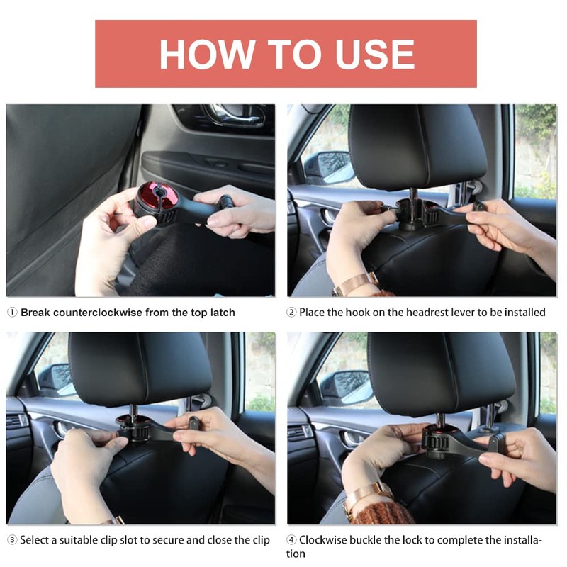 - Easy to Use Our car hook connects directly to the headrest mount by push button without additional tools. Press and turn the lock on the top of the hook clockwise to secure it, and remove it counterclockwise. It can clean the interior of your car and create an organised environment for you.