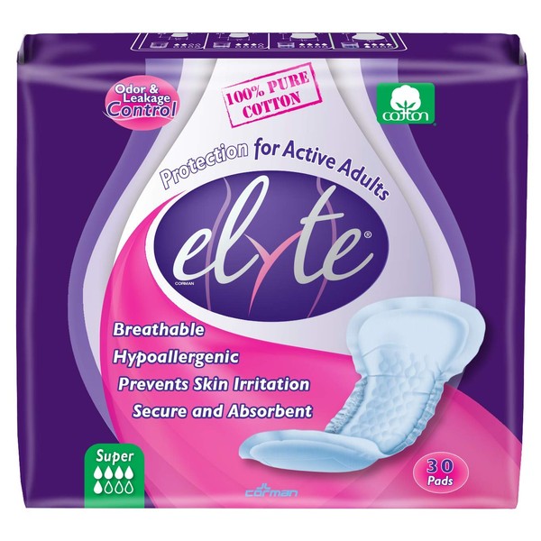 Organyc Elyte 100% Pure Cotton Bladder Control Pads, Sensitive Skin Safe, Super, 30 Count