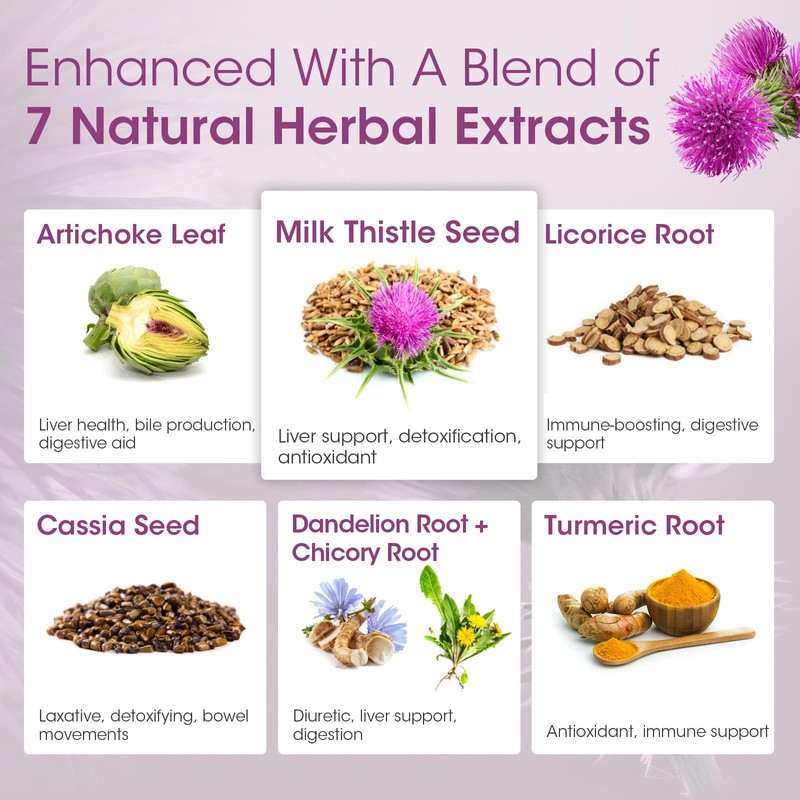 - Milk Thistle & Artichoke Extract : Each serving contains Milk Thistle extract, which includes an active ingredient called Silymarin. Silymarin helps liver cleanse detox & repair and maintain liver health. Artichoke Leaf aids digestion, reduces cholesterol, and possesses antioxidant properties.