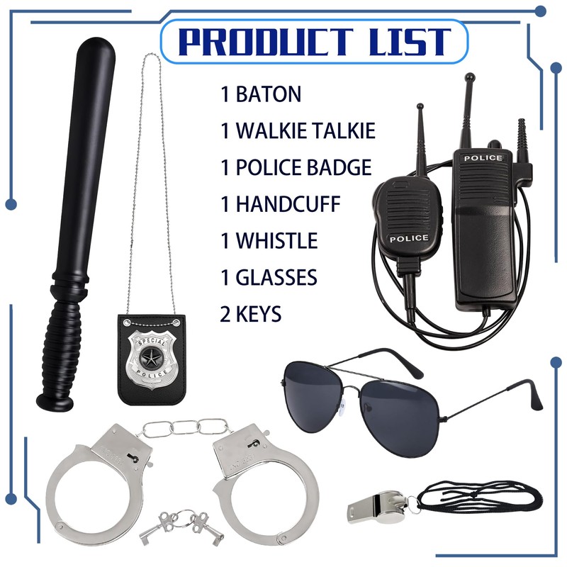 • POLIZEIKOSTÜM SET - Unser Polizeikostüm Zubehör umfasst ein Walkie-Talkie, eine Handschelle aus Metall, eine Polizeimarke mit einer silbernen Kette, einen Schlagstock, eine Trillerpfeife und eine Sonnenbrille, ein komplettes Set von Polizeikostüm Zubehör, um Ihr Rollenspiel erfolgreicher zu machen.