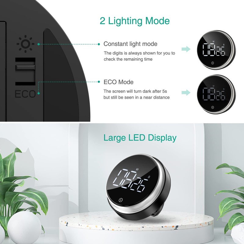 • LARGE LED DISPLAY & 2 LIGHTING MODE:The digital kitchen timer adopts a 3'' LED digital mirror display. The constant light mode always displays the current timing status. The ECO mode, the screen will turn dark after 5s