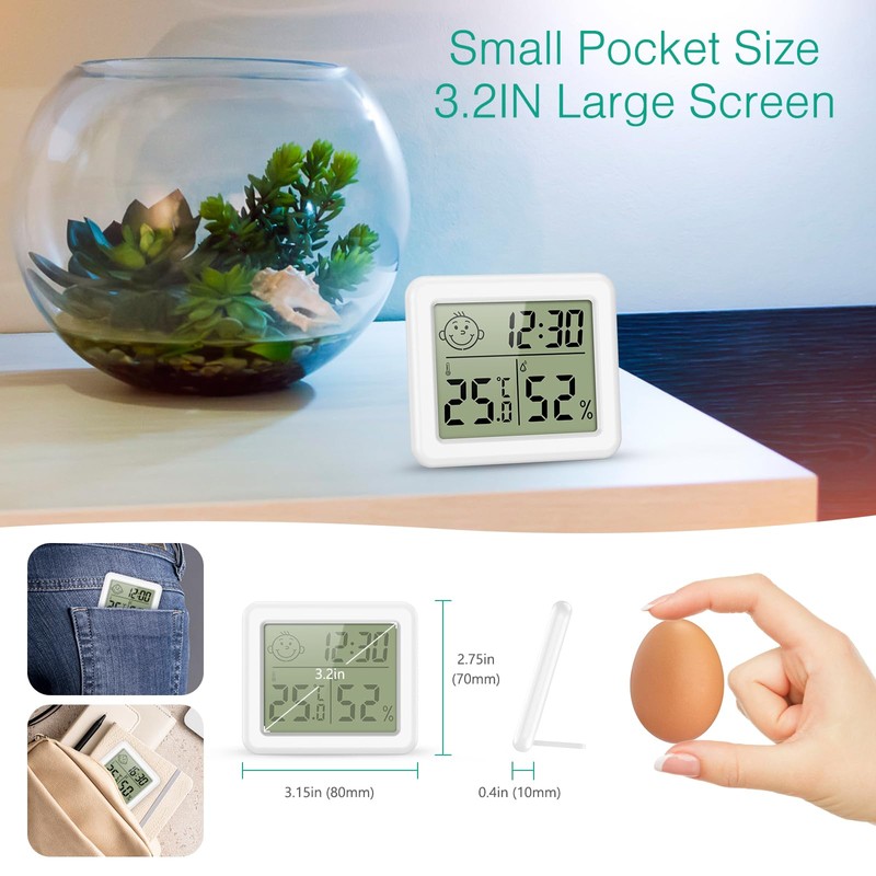 - Multifunctional Thermometer Hygrometer: the digital thermometer hygrometer has a 3.2 inch LCD display that keeps you up to date with accurate temperature, humidity, date and time (12h/24h). This hygrometer is equipped with a °C / °F switch button