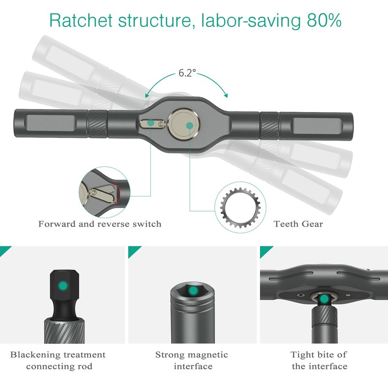 • Ratchet Flexible Design: It adopts a 6.2-degree ratchet, 58-gear forward and reverse ratchet structure design, the torque is 50N.m/50KG, saving 80% of the effort, and there is no need to adjust the wrist position