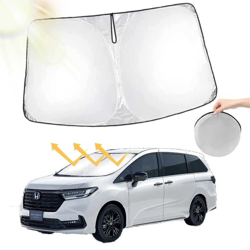 - (Cool even in the blazing sun) The advantage of the Odyssey sunshade is that it can protect your car from strong sunlight in summer. In addition to preventing the temperature rising when parked on your windshield, it is also convenient for you to use it to block glare or to hide your rest while you are on the windshield. The steering wheel and seat will be hot enough to not touch and prevent the event that you can't start immediately. It also helps reduce the time from cooling your car with air conditioner