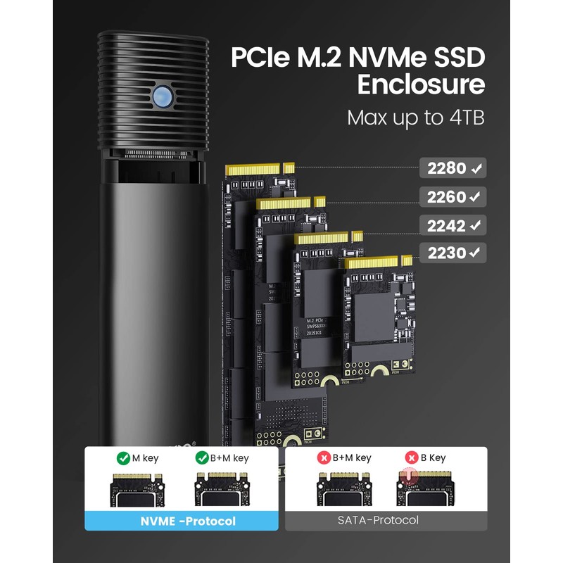 - 【Broad Compatibility】ORICO M.2 reader compatible with NVMe SSD in sizes 2230/2242/2260/2280, such as M.2 NVMe PCIe M key, PCIe B&M key SSD. NOT Compatible with M.2 PCIe AHCI and SATA SSDs. Support System Multi OS, Windows, Mac OS, Linux, Android