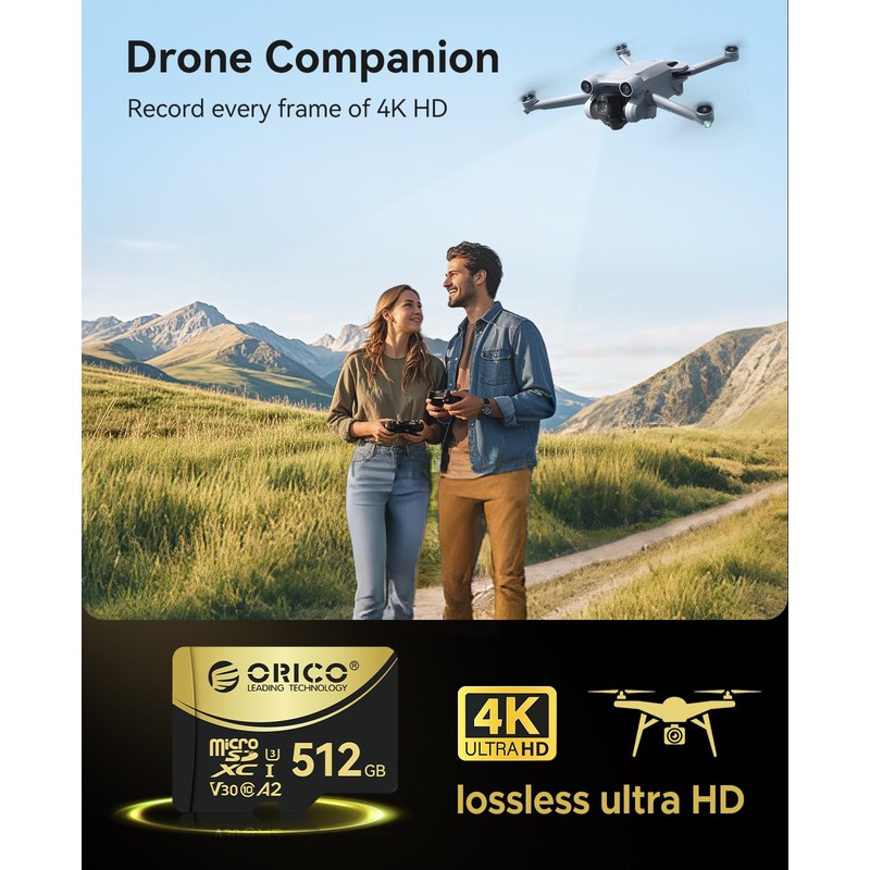 ORICO V3 512GB microSDXC UHS-I Memory Card, 180MB/s Read (Requires DDR 220 Readers), 160MB/s, 4K UHD Recording, U3, Class10, V30, A2, Micro SD for Drone, Game Console TF Card