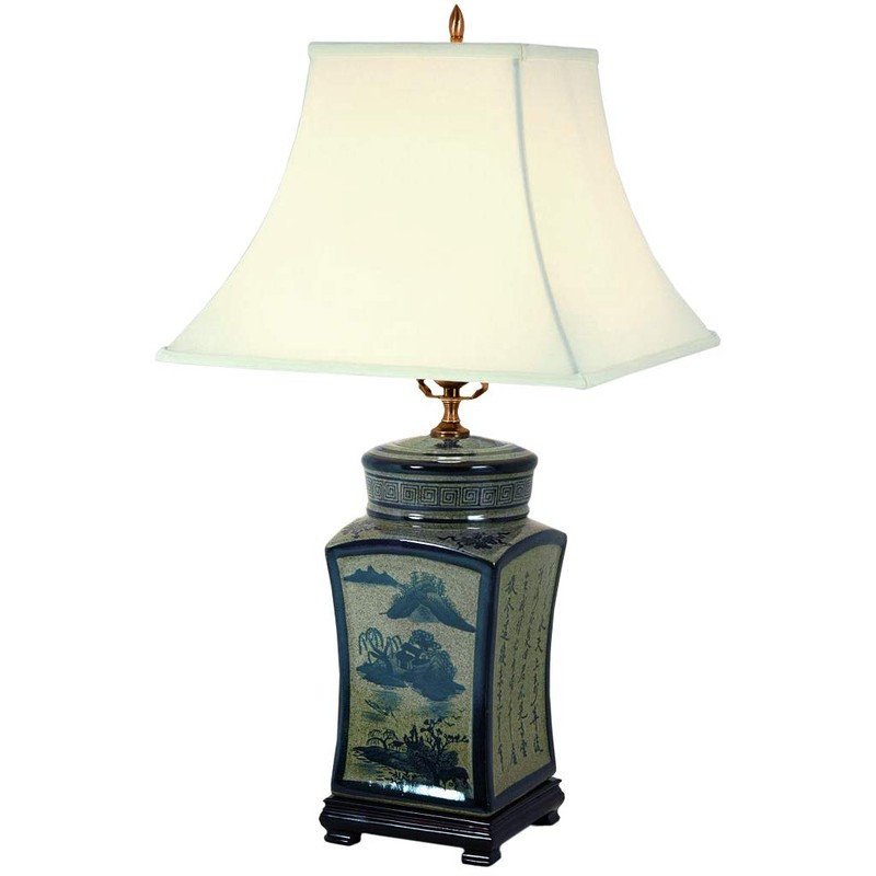 - Chinese porcelain square ginger jar body w/blue and white landscape and calligraphy design