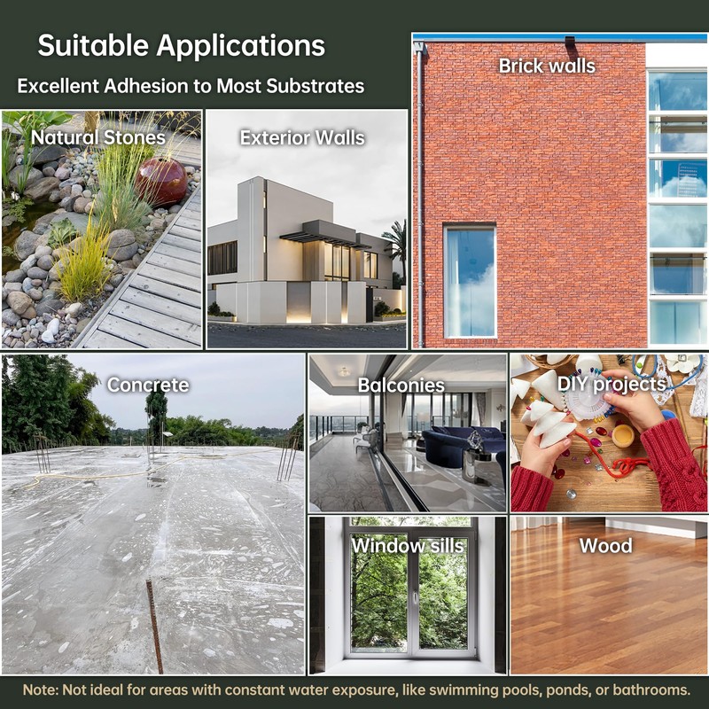 - Multi-use Clear Waterproof Sealant Protect Surfaces:outdoor,walls,external walls,external wall cracks,brick walls,outdoor concrete structures,fences,chimneys,eifs,windows,window sills,it also effectively protects wood,concrete,masonry,natural stones,stucco,brick,fabric,fiberglass,foam,DIY projects, and more