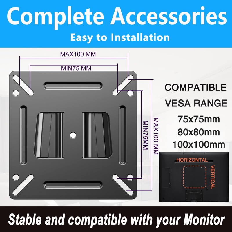 - Easy Installation: Install this computer monitor wall mount in minutes. It comes with all mounting screw pack hardware necessary for assembly.