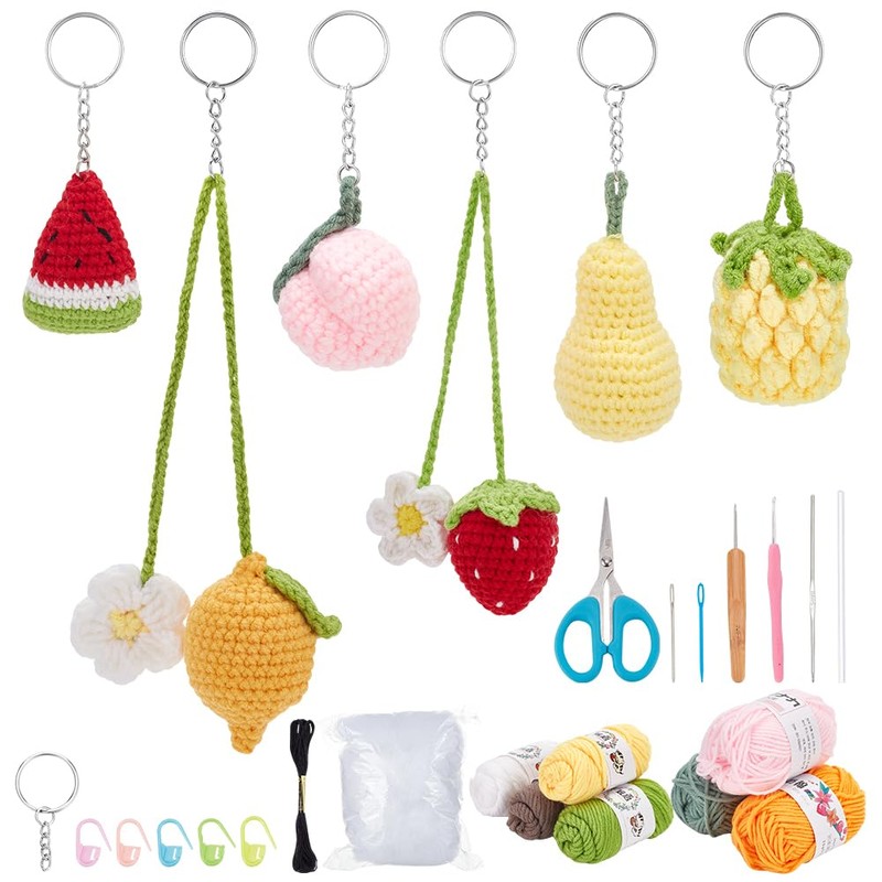 - Complete Crochet Kit: The mixed fruit crochet kit includes 7x colors yarn, 3x crochet hook, 2x blunt needle, 1x scissors, 2x plastic needle, 10x marker clasp, 1 pack stuffing and English instruction. It's enough to crochet at least 12 sets adorable strawberry peach pear pineapple lemon and watermelon keychain.