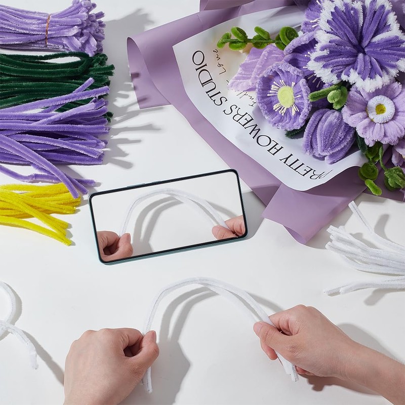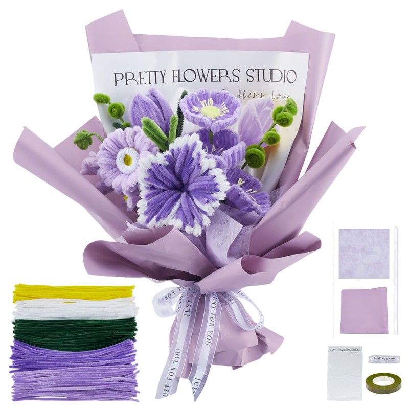 - Valuable kit: DIY art flower bouquet craft set includes 200 pcs pipe cleaner with assorted colors light purple, dark purple,white, green and yellow, 12pcs flower stems, 4pcs hot glue sticks, floral tape, wrapping paper, ribbons, 20 Pcs 40cm wire