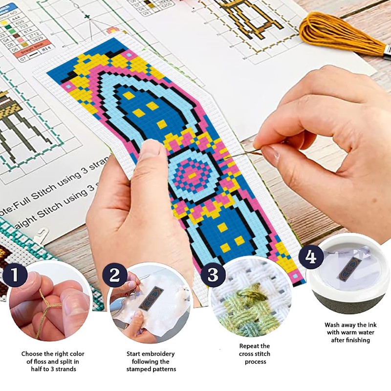 - Complete DIY Cross-stitch Kit: You will receive 6 x cross-stitch aida fabric with pre-printed pattern, backing felt, enough colors of thread, needles, threader, scissors and English instruction which is enough to complete 6 cross stitch Mandala Flower bookmarks.