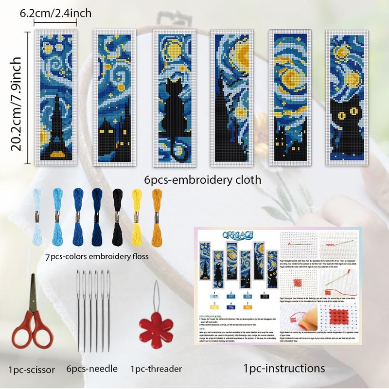 ORIGACH 6 Set Starry Night and Black Cat Cross Stitch Bookmark Kit for Beginner with Backing Felt Floss Instructions DIY Stamped Embroidery Bookmark Kit for Adults, Book Lovers