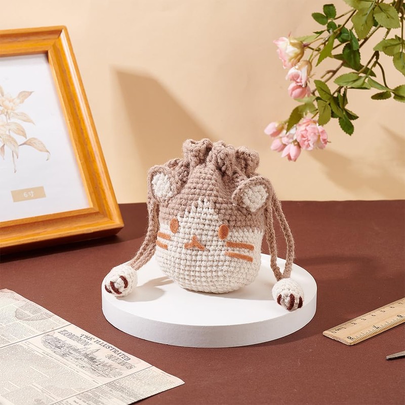 - All-in-one DIY crochet kit: the package contains sufficient colour yarn, hook, filling, needle, scissors, marking clasp and English instructions. It's enough to crochet 1 set of super cute kitten drawstring bags.