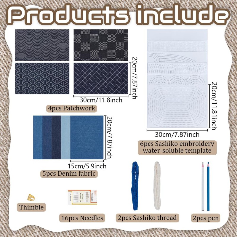 - DIY Sashiko Kit: This all-in-one kit features water soluble sashiko stabilizer(5 patterns and 1 blank), denim patchwork fabric, needles, thimble, ample thread, and instructions, providing everything you need to repair your clothing or create new pieces