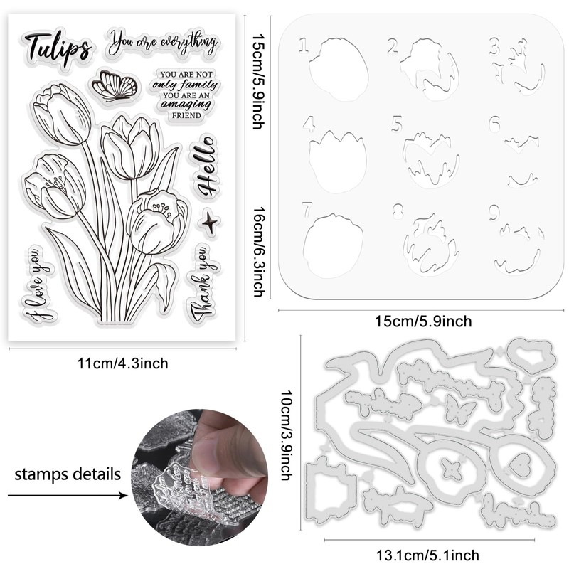 - Package Includes: You will receive 1 sheet clear stamps(6.3x4.33inch) with Tulip Bouquet, 1 set cut dies for cutting flowers and pattern , and 1 pc PET stencil(5.9x5.9 inch) for creating color layering effects. The whole set can meet your DIY craft needs