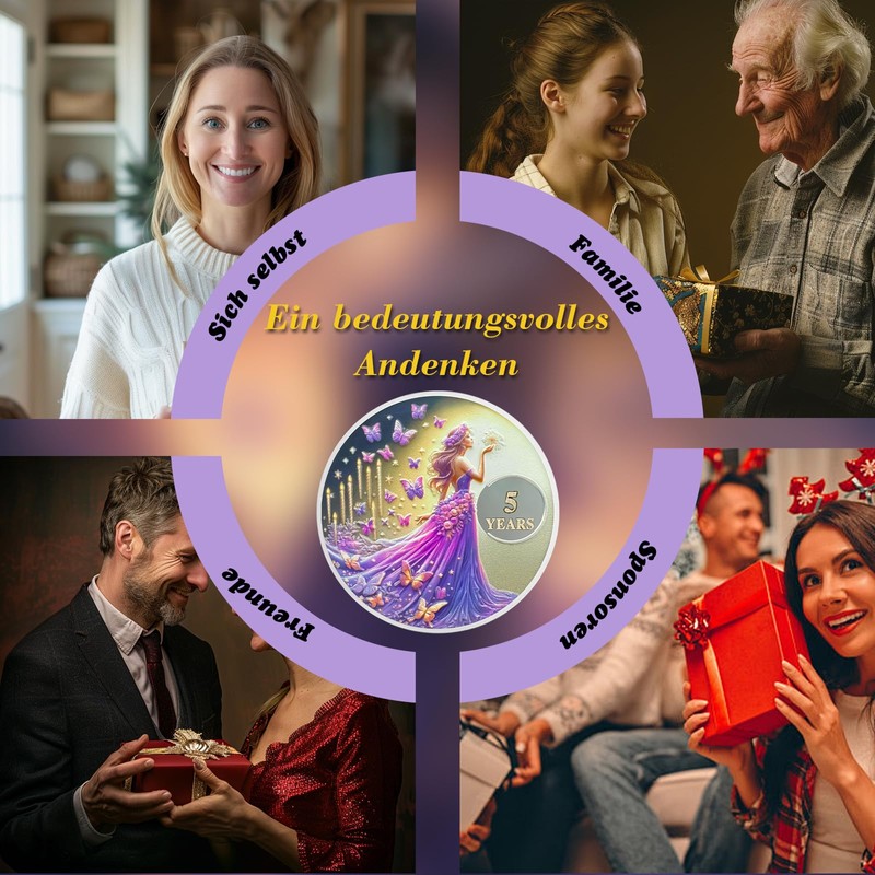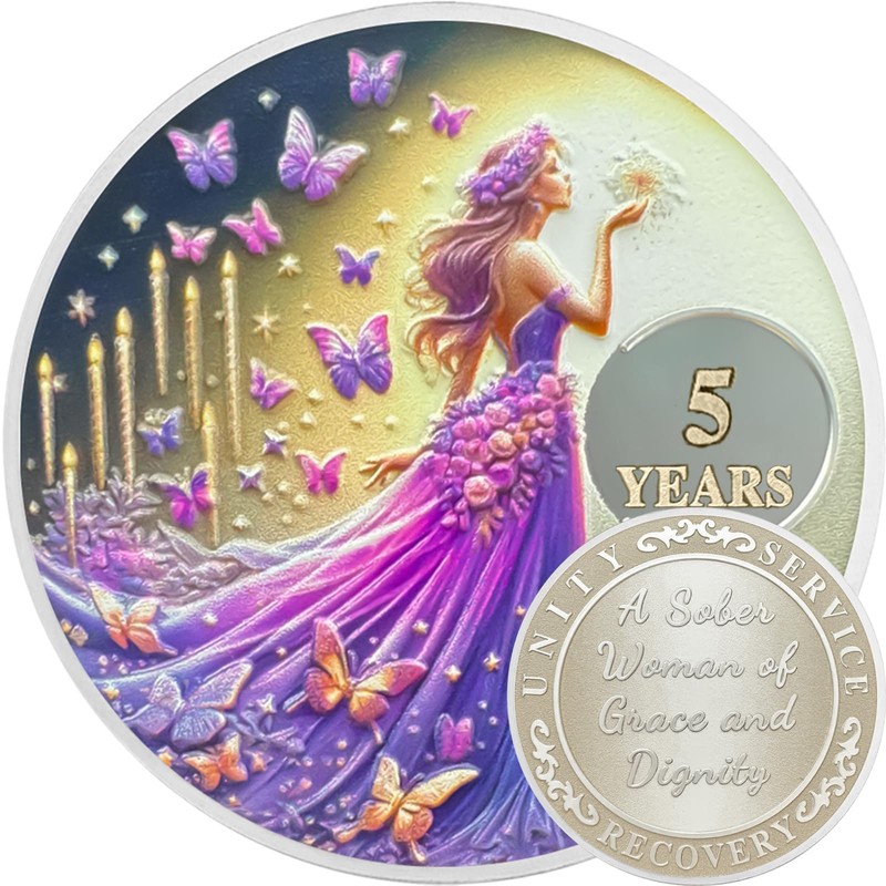 - Lila Schmetterlingsfee:Die Vorderseite dieser Frauen-Münze Nüchternheit zeigt eine elegante Frau in einem lila Kleid, umgeben von Schmetterlingen, die für Freiheit und Hoffnung stehen. Eine Kerze auf dem Woman Recovery Chip symbolisiert Licht und Führung. "2 JAHRE" steht für zwei Jahre Nüchternheit, was diese nüchterne Münze zu einem bedeutungsvollen Geschenk für jede Schwester in der Genesung macht. Perfekt für Frauen, die ihren Weg zur Nüchternheit feiern