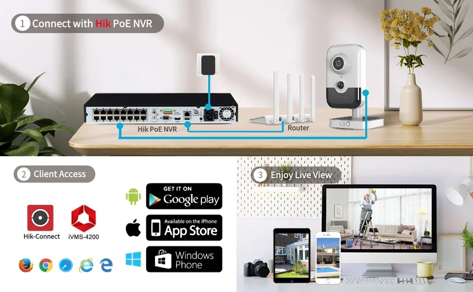 * Support iVMS-4200, Hik-Connect, Hik-Central.
