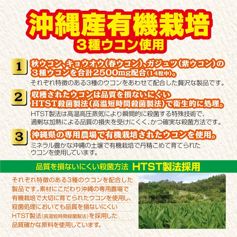 - 秋ウコン、キョウオウ(春ウコン)、ガジュツ(紫ウコン)の3種の有機栽培ウコンをあわせて配合。