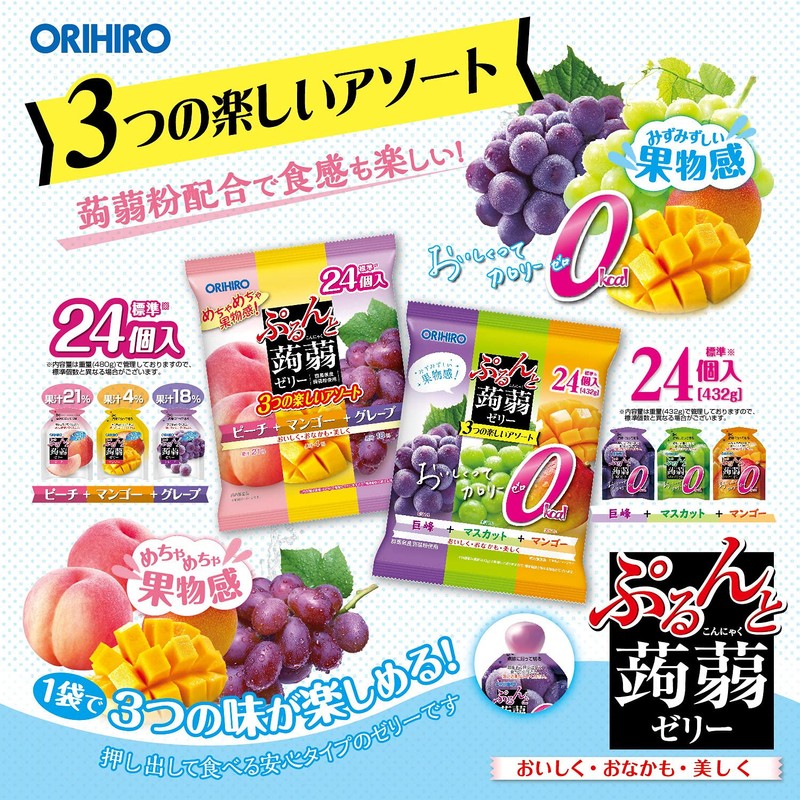 Orihiro Pluto Konjac Jelly Pouch, Large Bag, Zero Calories, Giant Peach, Muscat + Mango, 24 Pieces