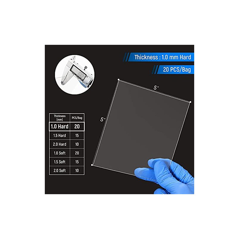 Color: Transparent Material: Soft / Hard Plastic Sheet Type: Soft / Hard Thickness: 1.0mm / 1.5mm / 2.0mm Length :130mm/5.11'(appr.) Width:130mm/5.11'(appr.) Package included:1 bag vacuum forming sheet Soft 1.00MM/20pcs per bag Soft 1.50MM/15pcs per bag Soft 2.00MM/10pcs per bag Hard 1.00MM/20pcs per bag Hard 1.50MM/15pcs per bag Hard 2.00MM/10pcs per bag