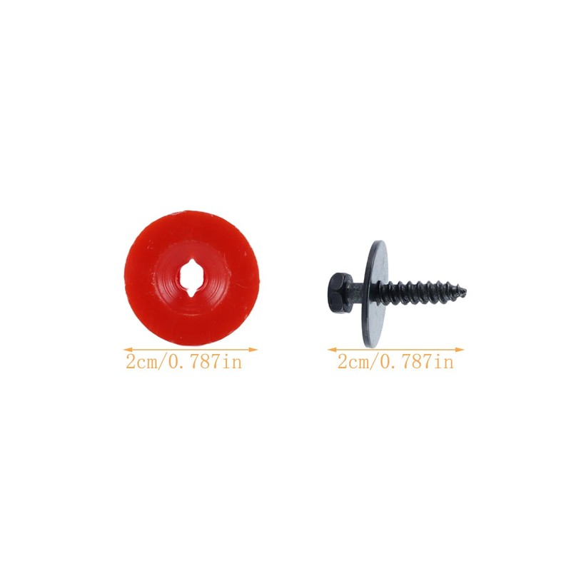 - Red clips size 19X13.5MM screws size 22.6X18MM their measurements align with the engine lower protection cover and shield mounting points for right fitting.