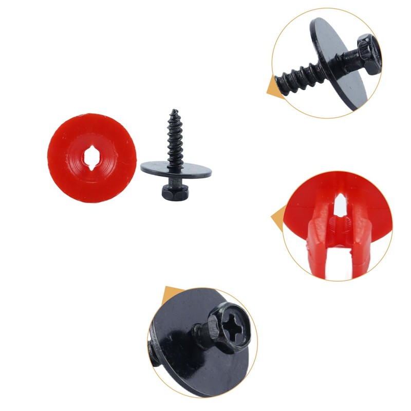 - Set has 10 red clips and 10 black screws 20 pieces total good for changing old or broken fasteners when servicing or fixing the engine covers.