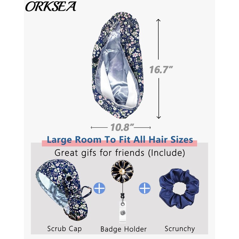 - 【Premium Quality Materials】: Made with 100% cotton outer fabric and a luxurious satin inner lining, our surgical cap offers breathability and a soft feel against your skin and hair.ORKSEA nurse caps have an elasticized band and ties in the back that can be worn two ways: Tied loosely in back or Tied up in a ponytail. One size can fit most.