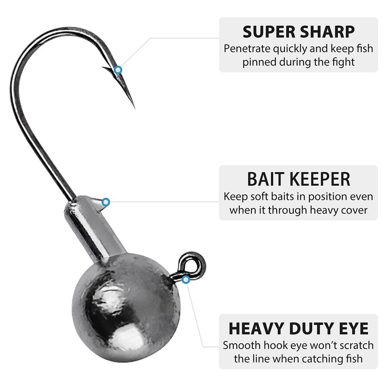- 🐟【SHARP JIG HOOK】The jig head hook is super sharp which makes it easy for you to insert the soft bait deeply, and the barb of jig hook can prevent fishes from sliding or running away.