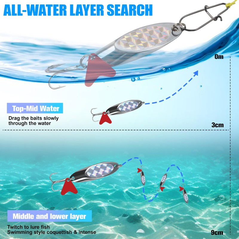 -Natural Movement Underwater: Depending on your handling, the fishing spoon lure produces a wild and erratic action. When fast retrieve, it will pumping out serious flash, movement; when slow retrieve, the hard metal spoon will swing slightly, just like a small fish wandering leisurely. All these effects make fish want to give chase, bump it.