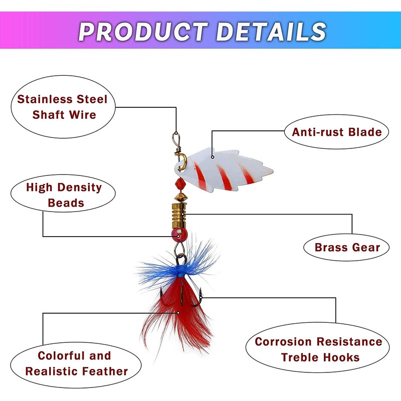 - Great quality: spinner made of stainless steel, brass gear, plastic pearl, polished metal blades, hard bait with detailed laser coating