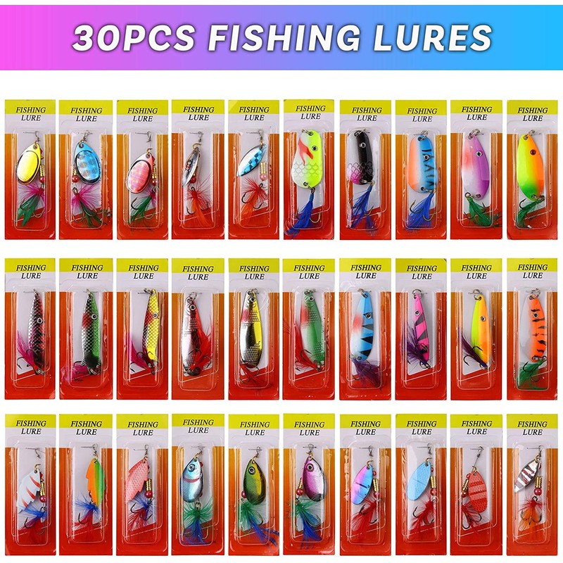- Lure kits: the huge kit contains 30 spinners. It can be used at any time and in any place for different types of kits