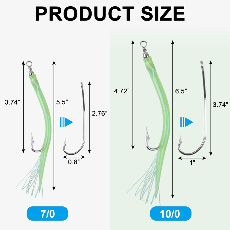 - 🐟【Specification】10pcs/pack Classic Striped Bass Tube Lures. Color: red, green(glow in the dark). Size: 7/0 (Length: 5.5inch), 10/0 (Length: 6.5inch).