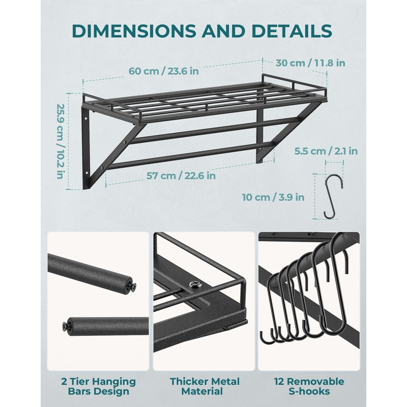 OROPY 23 Inch Wall Mounted Pot Rack Storage Shelf with 2 Tier Hanging Rails 12 S Hooks included, Ideal for Pans, Utensils, Cookware, Plant Black
