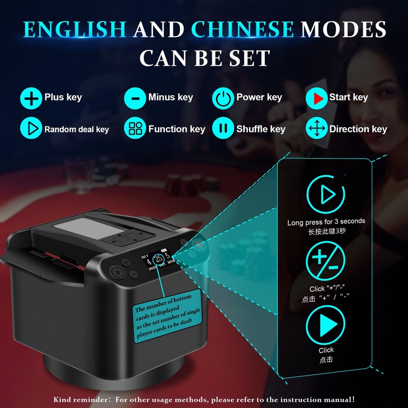 - ServiceThe automatic card dealer machine you can set the number of people, cards, cards, base cards, paired remote control, etc.,before leaving the factory, we also carried out a strict quality check, so in use did not achieve your ideal effect, may be because of the inaccurate setting, please do not worry, we are equipped with detailed instructions, the product page is equipped with a guide video, If you still can't solve your confusion, we'll answer your questions online