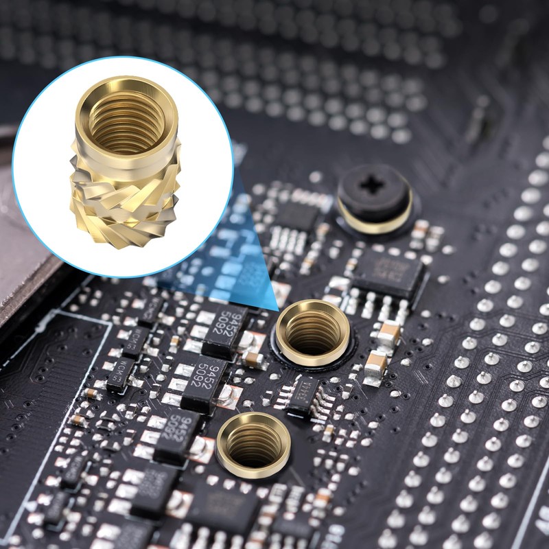 - 【Application】: Insert the threaded nut into the hole and heat the nut with a soldering iron. After heating, the threaded insert is pressed into the part. Then the screws are mounted with the cooled nuts. Using ultrasonic waves or a soldering iron, nuts can be easily inserted into plastic parts.