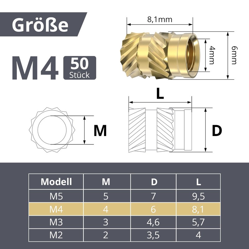 ORTAVA M4 Thread Insert, Pack of 50 Press-in Nuts, Brass Embedding Nuts, Knurled Nuts, M4 x 8.1 x 6 mm, Threaded Inserts for Plastic Parts by Heat or Ultrasonic in 3D Printer Parts