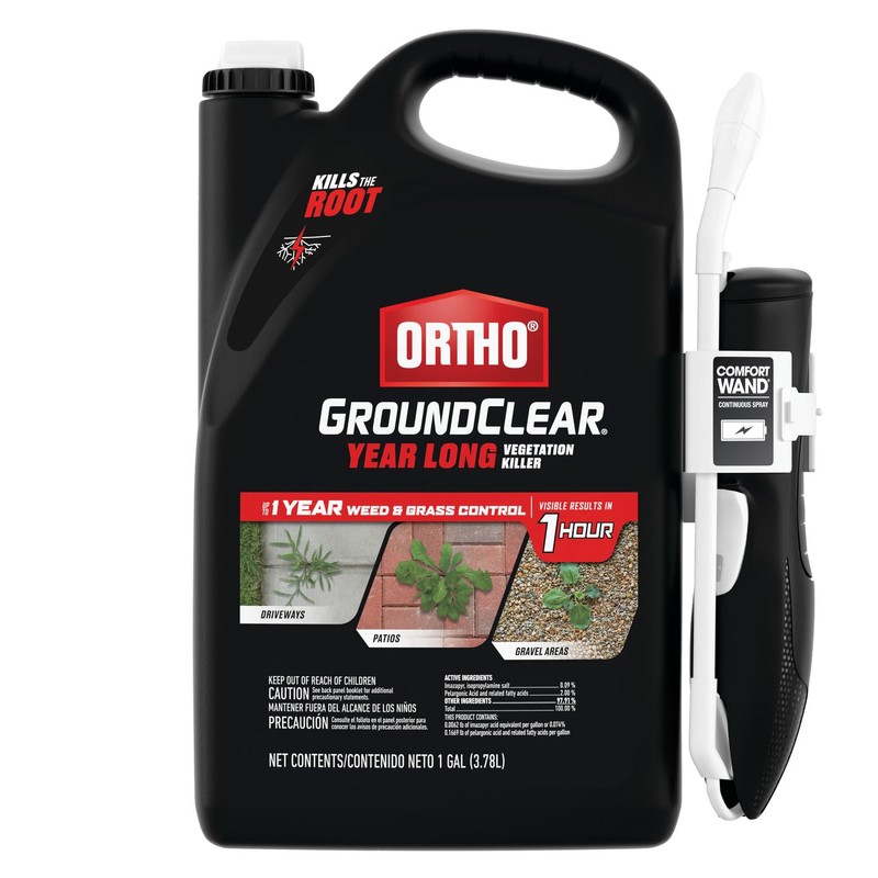 Take on all the weeds and grasses you don't want around your home with Ortho? GroundClear? Year Long Vegetation Killer. This weed killer kills weeds, grasses and unwanted vegetation, and prevents new growth for up to 1 year. This fast-acting weed and grass killer starts working immediately. Use on areas where weeds, grasses and plants are not desired, including driveways, sidewalks, gravel areas, rock and desert landscapes, under decks, on parking areas, along fences and curbs, and in unplanted areas. The included Comfort Wand? allows you to target weeds and easily apply without bending or pumping. To apply, prep and connect the wand, set the sprayer to your desired setting and begin spraying weeds. For best results, apply to actively growing weeds on a sunny day when temperatures are above 60F. Apply only to areas where vegetation is unwanted for 1 year. Keep people and pets off treated areas until spray has dried. Trust Ortho? to take down weeds and keep them gone.