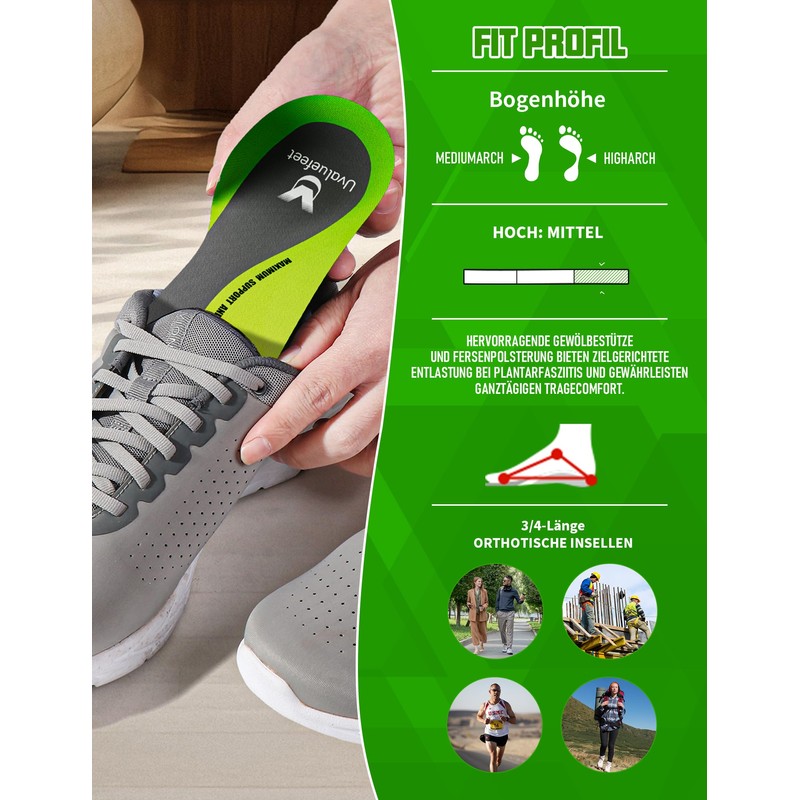 - Orthopaedic insoles with arch support: Do you suffer from foot pain, plantar fasciitis, overpronation or discomfort caused by flat feet/fatigue? Uvaluefeet 3/4 length orthotic insoles provide comfortable medial arch support, help correct misalignment and relieve discomfort. These arch support insoles conform to the arch of the foot, reducing local pressure and maintaining a natural foot posture.
