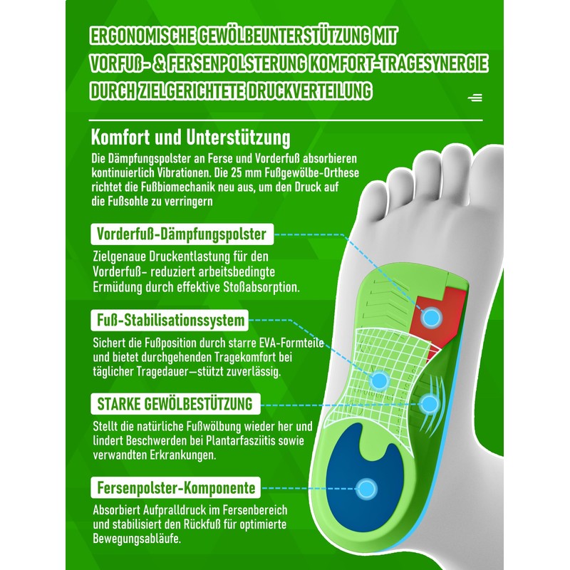 - Stability thanks to deep heel cup: The deep U-shaped heel cup fixes the heel in the correct position, improves balance and reduces friction. Optimises gait, reduces stress in knees/hips/back and prevents slipping. Essential as overpronation pads and for medium to high arch support during active lifestyles.