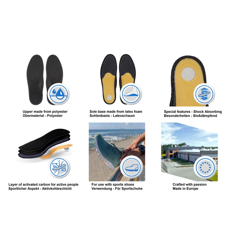 - HYGIENIC ODOR CONTROL: As sports shoes get sweaty easily and build up bacteria, the Super Active Sport Insoles have carbon-based odour control system to make sure smelly bacteria build-up is prevented
