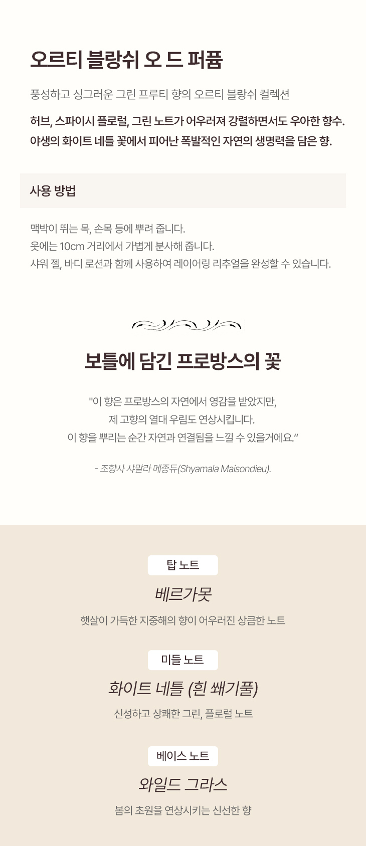 사용방법 맥박이 뛰는 목, 손목 등에 뿌려줍니다. 옷에는 10cm 거리에서 분사해 줍니다. 샤워 젤과 바디 로션과 함께 사용해 레이어링 리추얼을 완성할 수 있습니다.