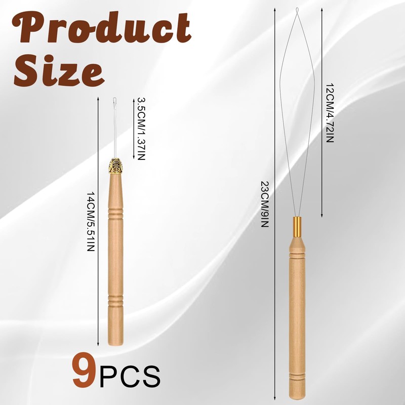 Oruola 9Pcs Hair Extension Tools, Bead Threader with Wooden Handle,Hair Extension Tool Kit,Hairs Extension Loop Tool and Hairs Crochet Hook for Silicone Link Rings Beads and Hair or Feather Extensions