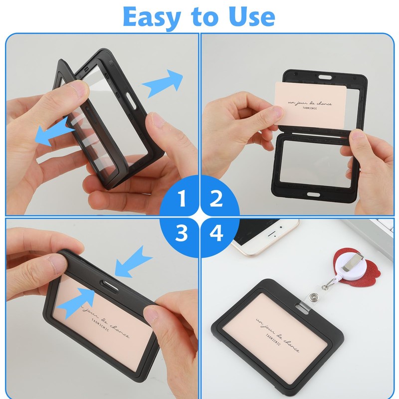 - Easy to Use The badge holder can be easily opened horizontally through the card slot on the top of the badge holder, insert the card, and then press the two parts of the badge holder together to close it.