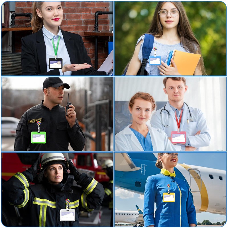- Easy to Carry The badge holder can be attached to a retractable badge reel, lanyard or flat belt through the hole on the top of the work ID holder. Badge holders for badges are very suitable for office workers, firefighters, maintenance workers, students, doctors, etc.