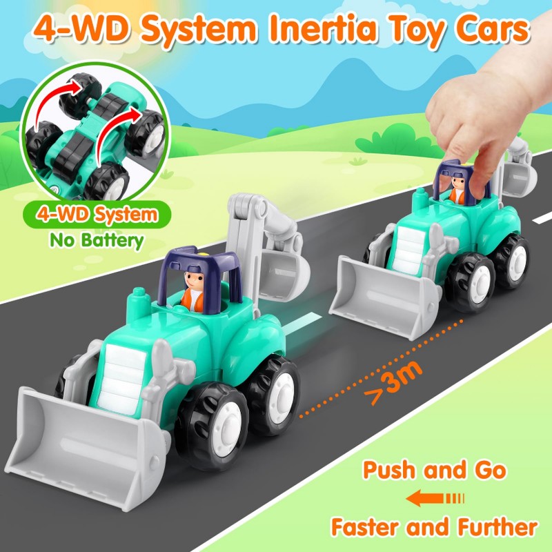 CUTE FRICTION POWER CARS: Colorful toys for 1 year old boy set consists of 4 inertial construction vehicles: crane truck, road roller & breaker, bulldozer & excavator, tractor with wagon. Various toy cars can let your baby know and identify different cars. Equipped so that boys can experience fun by friction powered car, suitable for kids age 18 months and up.